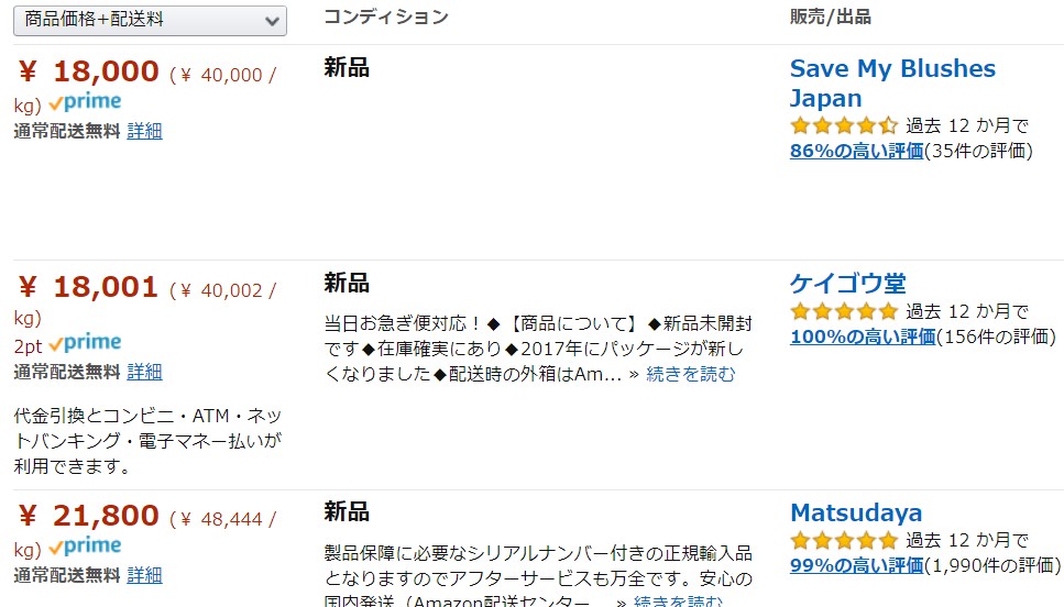 現時点の最安値販売店は評価86%とあまり高くないですしね…